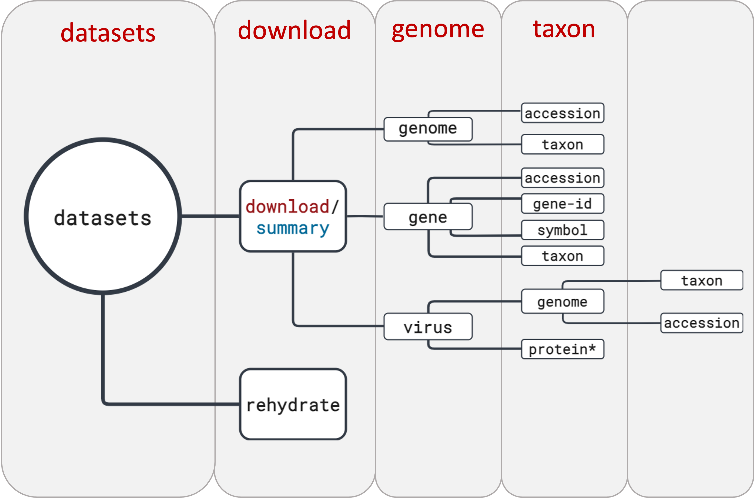 The NCBI Datasets CLI command structure is very intuitive. If you take a look at the diagram below, you will notice that the commands are built by choosing one option from each vertical rectangle. Let's start!
