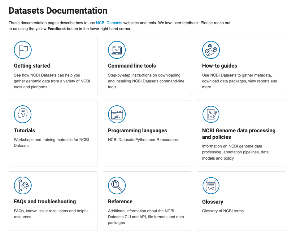 Refer to NCBI's [download and install](https://www.ncbi.nlm.nih.gov/datasets/docs/v2/download-and-install/) documentation for information about getting started with the command-line tools.